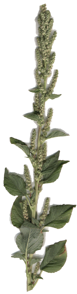 Amaranth an annual grows up to about 6 ft [by the royal measure of king George III], (2meters) [for everyone else] with course alternating oval pointed leaves. Often the tap root has a reddish color. From the base of the leave stems grow the seed spikes. The tiny black seeds are surrounded by sharp bristly bracts which need to be removed before eating See the threshing / winnowing demonstration on video 1 of Dining on the Wilds .